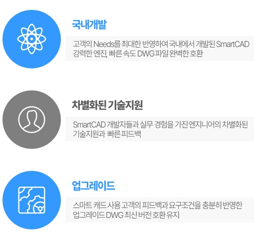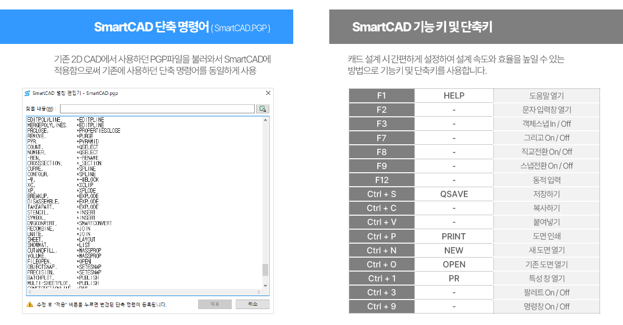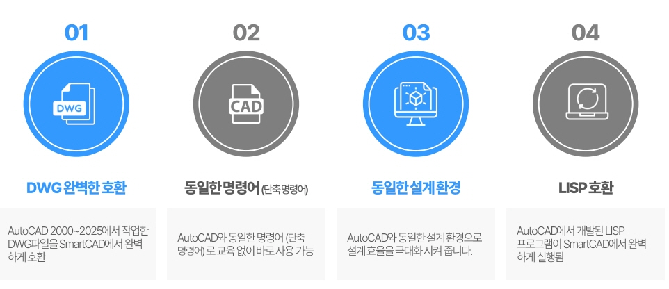 AutoCAD와 완벽한 호환으로 SmartCAD 전환 후 교육없이 실무 적용 바로 가능합니다.
